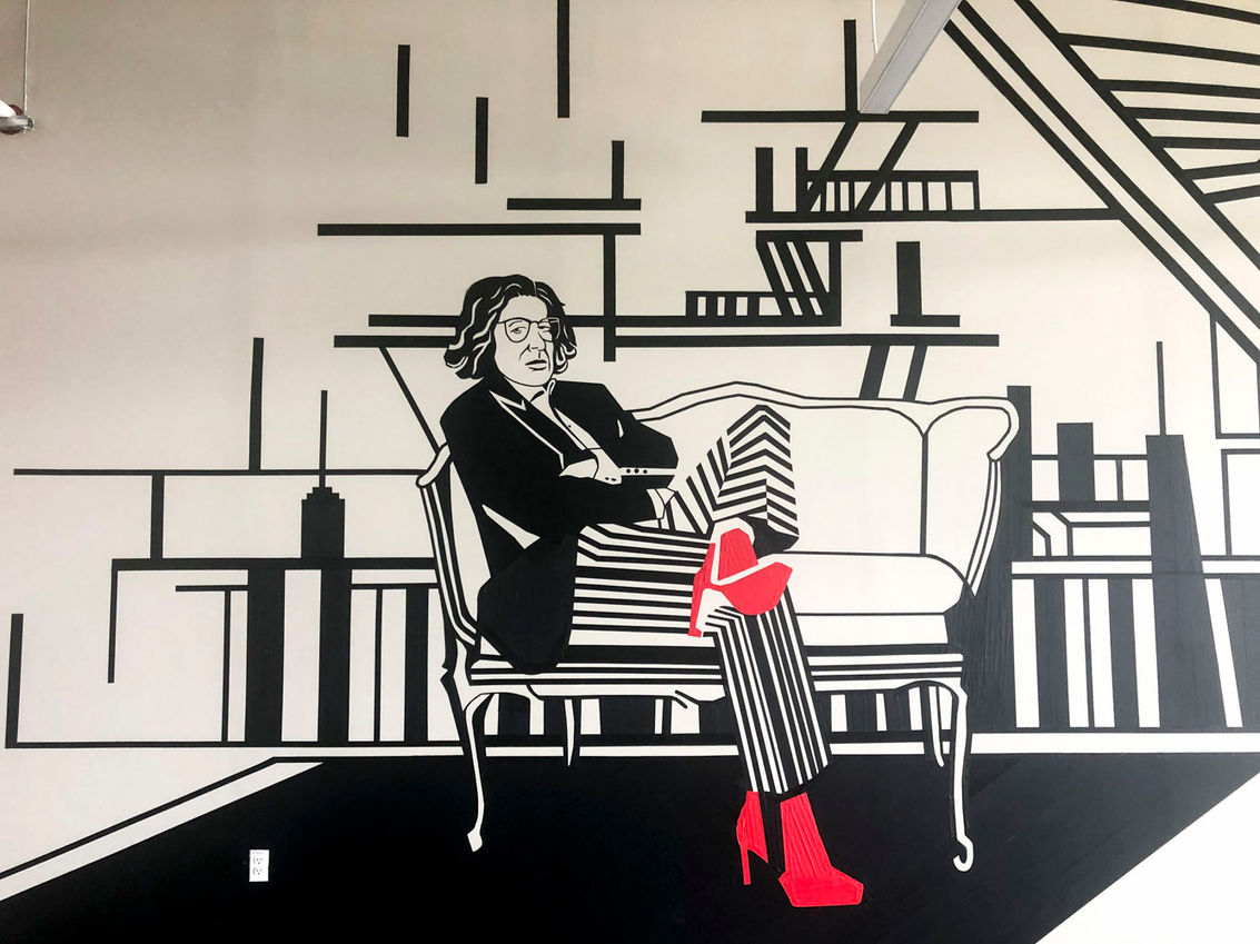 These murals were completed for Netflix's Production Studios in Brooklyn, NY in September of 2021. Gensler designed the murals to showcase some of Netflix's most popular original series: Pretend It’s a City with Fran Lebowitz, Russian Doll with Natasha Lyonne and She’s Gotta Have It with DeWanda Wise. The Novo Arts team used projectors to sketch the designs, and then constructed the murals on top of those outlines. The mural featuring Lebowitz, Lyonne and Wise, is composed entirely of black and red gaffer’s tape, to pay homage to its frequent use and vital necessity in the world of film production. The other mural references the famous Netflix logo that appears on screen before any viewing and is dual textured: composed of a full sheet of colored vinyl underneath black gaffer’s tape.