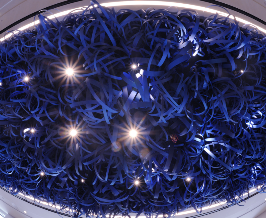 While ticker tape is a thing of the past, it still commands space in this sculpture on the ceiling of the New York Stock Exchange. Composed of wood veneer strips in a loop-de-loop fixture, its striking blue coloring and unique composition emphasize the power of "The Big Board."